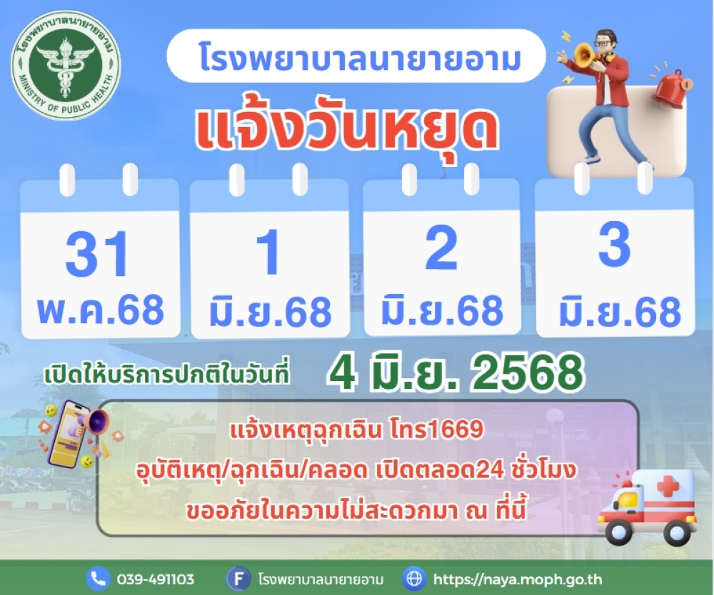 ประกาศโรงพยาบาลนายายอาม แจ้งวันหยุด ในวันที่ 3 - 5 พฤษภาคม พ.ศ.2568 เปิดให้บริการปกติในวันที่ 6 พฤษภาคม พ.ศ.2568 แจ้งเหตุฉุกเฉิน โทร1669 อุบัติเหตุ/ฉุกเฉิน/คลอด เปิดตลอด24 ชั่วโมง ขออภัยในความไม่สะดวกมา ณ ที่นี้