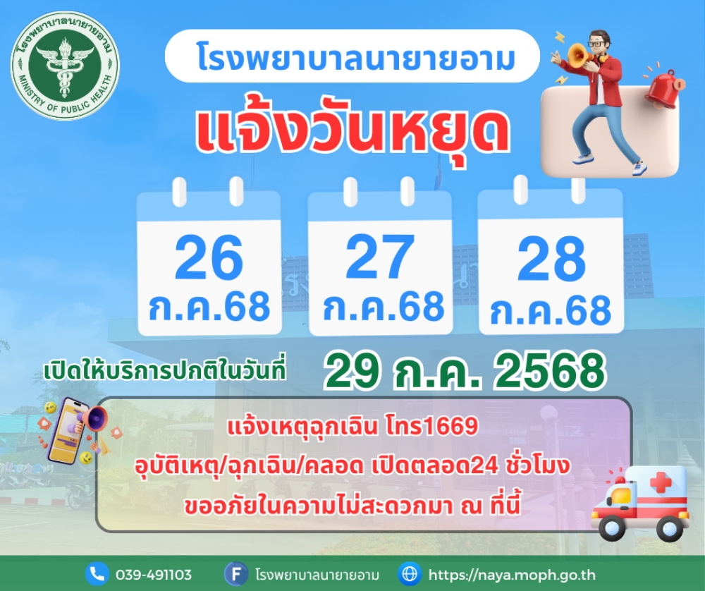 ประกาศโรงพยาบาลนายายอาม แจ้งวันหยุด ในวันที่ 26 กรกฎาคม ถึงวันที่ 28 กรกฎาคม พ.ศ.2568 เปิดให้บริการปกติในวันที่ 29 กรกฎาคม พ.ศ.2568 แจ้งเหตุฉุกเฉิน โทร1669 อุบัติเหตุ/ฉุกเฉิน/คลอด เปิดตลอด24 ชั่วโมง ขออภัยในความไม่สะดวกมา ณ ที่นี้