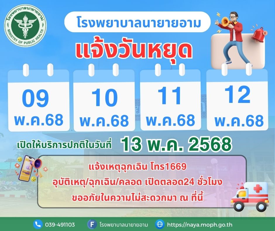 ประกาศโรงพยาบาลนายายอาม แจ้งวันหยุด ในวันที่ 9 - 12 พฤษภาคม พ.ศ.2568 เปิดให้บริการปกติในวันที่ 13 พฤษภาคม พ.ศ.2568 แจ้งเหตุฉุกเฉิน โทร1669 อุบัติเหตุ/ฉุกเฉิน/คลอด เปิดตลอด24 ชั่วโมง ขออภัยในความไม่สะดวกมา ณ ที่นี้