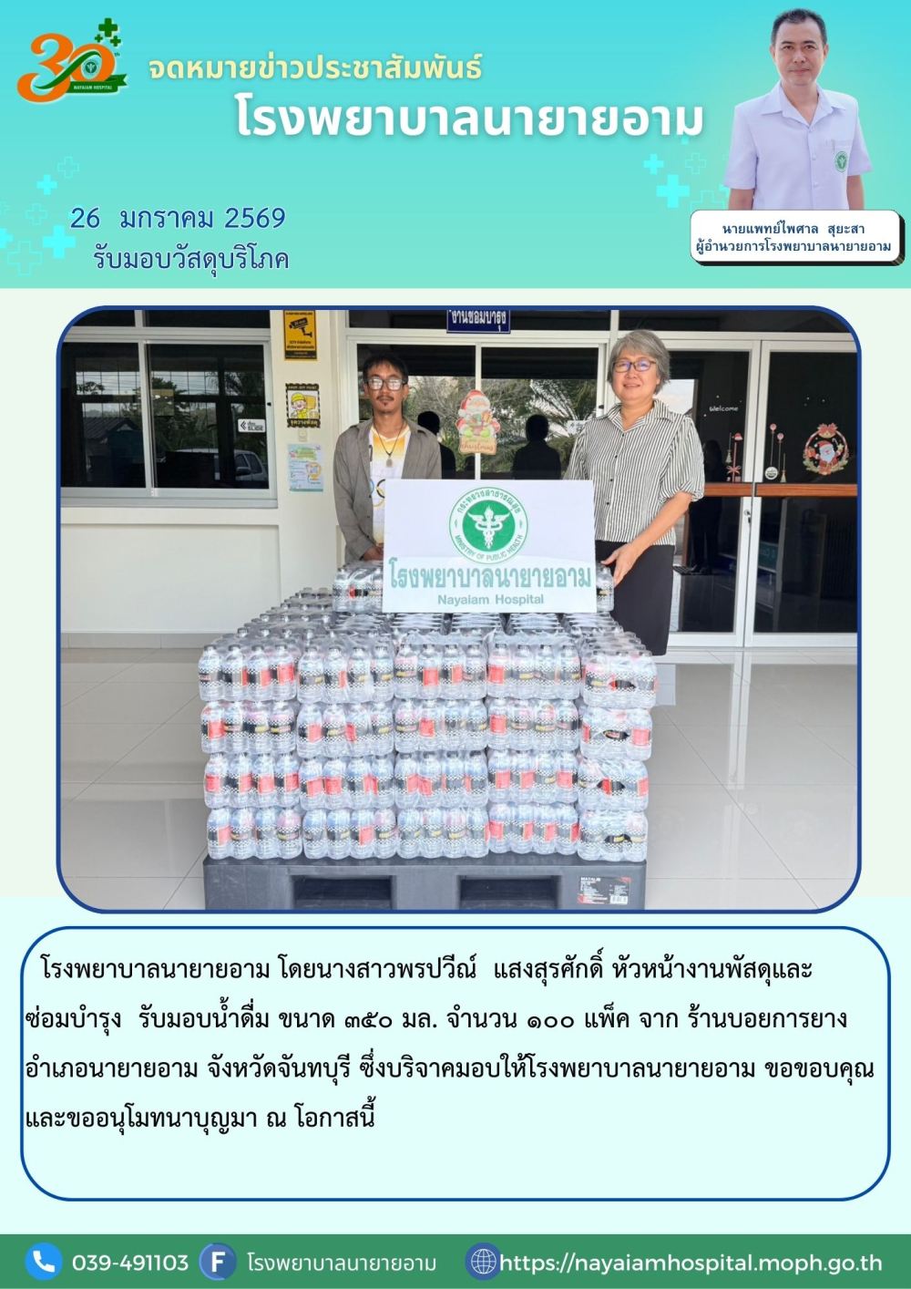 วันที่ 1 มกราคม 2568 นายแพทย์ไพศาล สุยะสา ผู้อำนวยการโรงพยาบาลนายายอาม รับมอบเงินบริจาค เป็นจำนวน 50,000 บาท จาก บริษัท ไมตรีจิต จันทบุรี จำกัด เพื่อสนับสนุนการปฏิบัติงานดูแลผู้ป่วย ของโรงพยาบาลนายายอาม